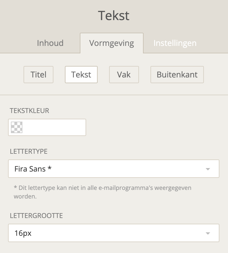 Tot voor deze datum kon op deze plek ook de tekstgrootte, het lettertype en de uitlijning worden ingesteld. Het probleem daarmee was dat de extra code die hiervoor werd aangemaakt vaak voor problemen zorgde bij de weergave in verschillende e-mailprogramma's. De regelafstand kon bijvoorbeeld te klein worden, bij uitlijnen kon het lettertype verloren gaan en bij weergave op mobiele telefoons konden verschillen optreden in tekstgrootte. Veel van onze klanten kwamen dit tegen. Daarom hebben we besloten deze opties hier weg te halen en te verwijzen naar de hierboven genoemde methodes om de tekstweergave aan te passen.