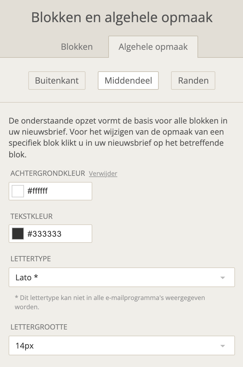 Aan de linkerkant van het scherm ga je naar Blokken en algehele opmaak (je krijgt dit te zien door naast de nieuwsbrief te klikken), en dan naar Algehele opmaak / Middendeel. Hier kunt je aangeven wat de standaardinstellingen voor alle blokken van jouw nieuwsbrief moeten zijn.