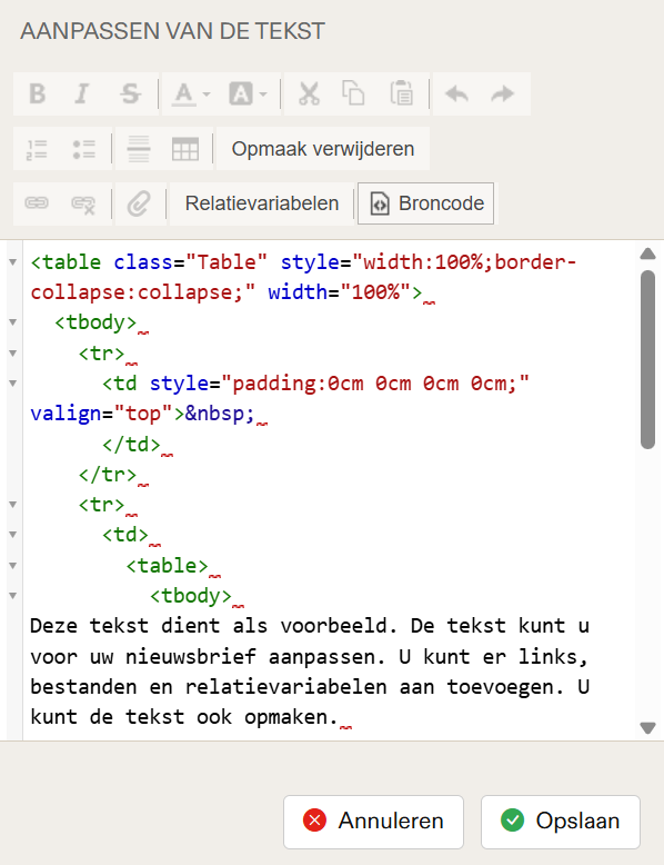 Soms bevat de tekst zelf al opmaak, bijvoorbeeld wanneer je deze vanaf een website hebt gekopieerd. Doordat er al opmaak in de broncode van je tekst staat, zal de weergave van je tekst anders zijn dan je misschien had bedoeld. Je kunt dit controleren door op het knopje 'Broncode' te klikken.
