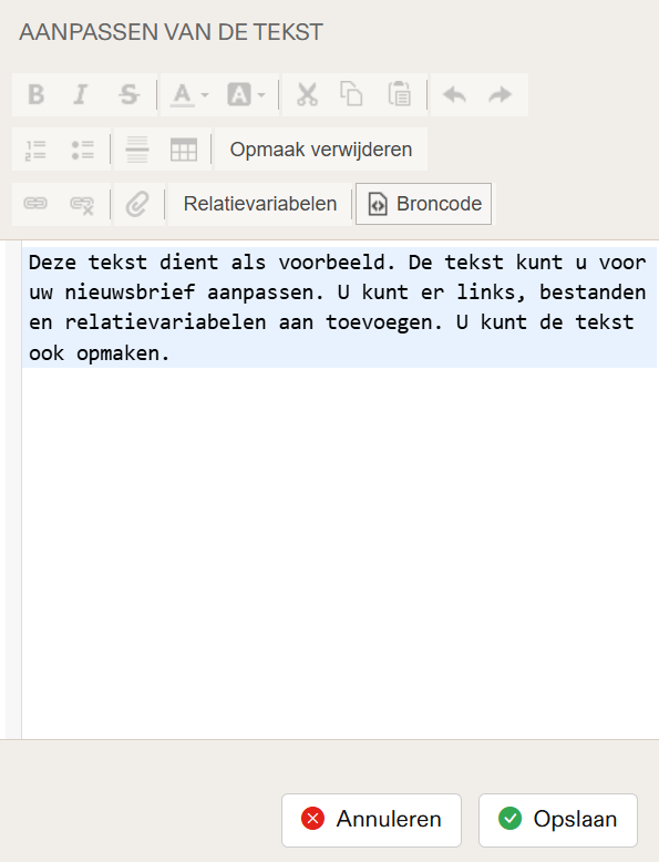 Staat er nog opmaak in die je er liever niet hebt staan? Dan kun je ook de reeds-opgemaakte tekst vervangen door kale tekst. Dit doe je door eerst je tekst met opmaak in een notitieblok te plakken (zoals in Kladblok) en deze kale tekst vervolgens te kopiƫren en te plakken op de gewenste plaats in de editor. Vervolgens kun je weer bij 'Broncode' controleren of alle ongewenste opmaak is verdwenen.