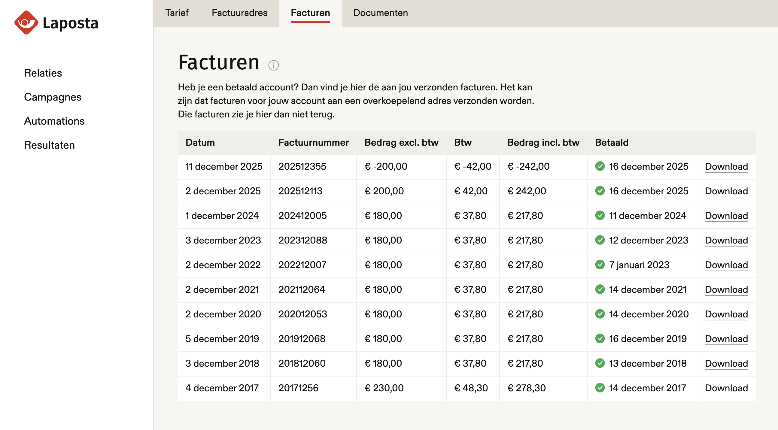 Heb je vragen over een factuur? Stuur dan een e-mail naar debiteuren@laposta.nl.